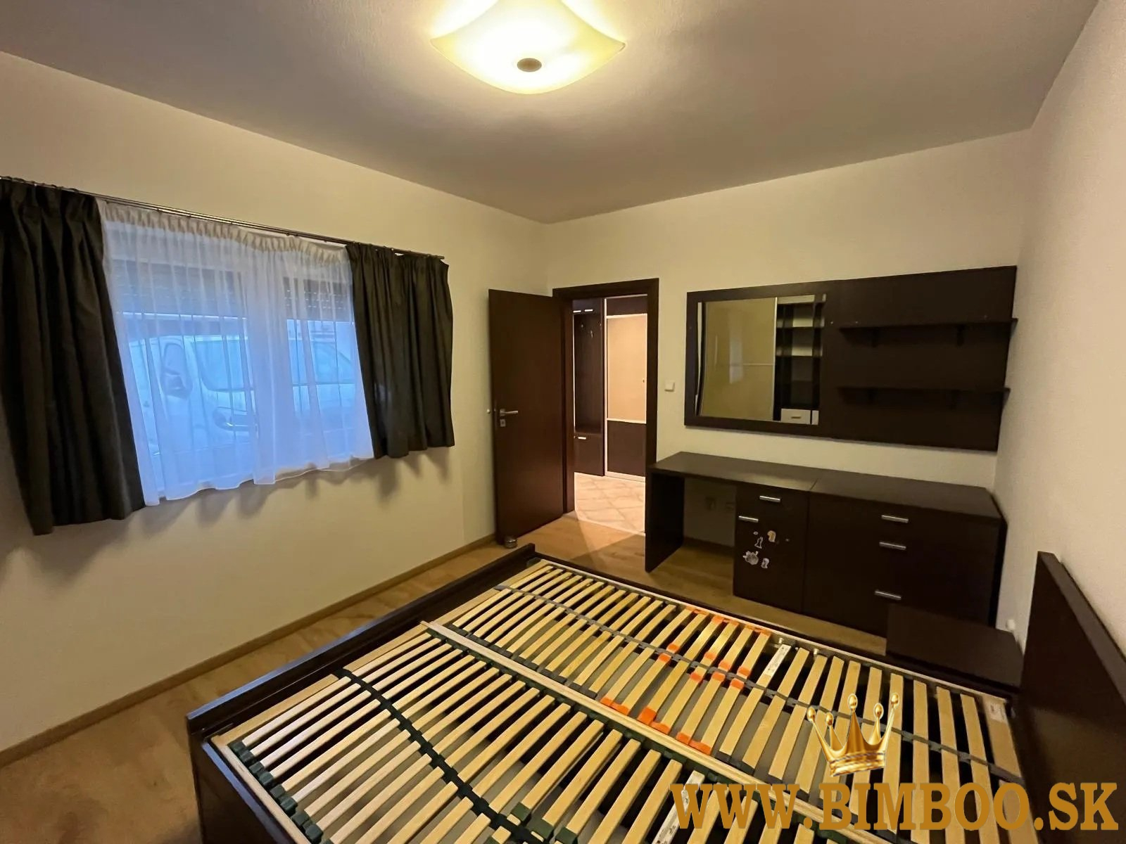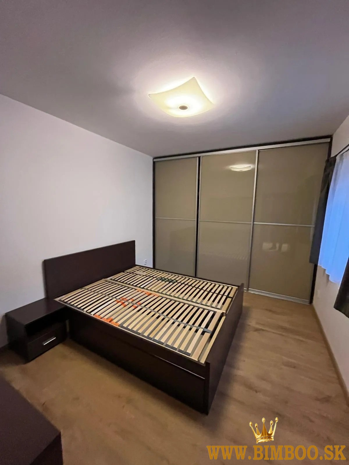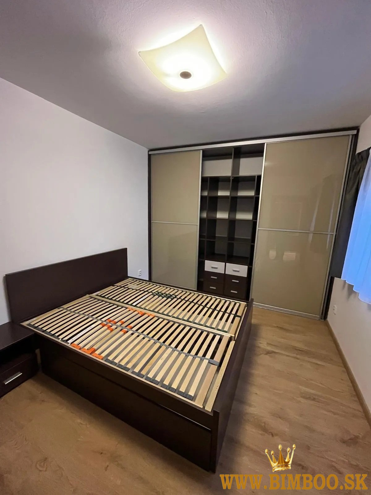 spálňa s manželskou posteľou a šatníkovými skriňami na mieru